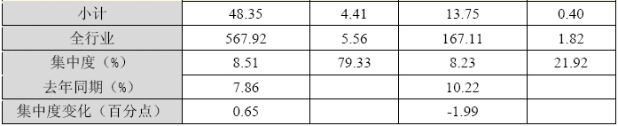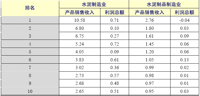 1季度,水泥制造業(yè)前10家企業(yè)銷售收入集中度比去年同期略有提升,利潤集中度則更是高達(dá)近8成。而水泥制品制造業(yè)前10家企業(yè)銷售收入集中度比去年同期則有所下滑,實現(xiàn)利潤只占行業(yè)總體的2成多。 水泥制造業(yè)前10家企業(yè)銷售收入為48.35億元,集中度為8.51%,比去年同期上升了0.65個百分點(diǎn),比上季度末上升了3.57個百分點(diǎn);實現(xiàn)利潤為4.41億元,集中度為79.33%,比上季度末上升了77.14個百分點(diǎn)。水泥制品制造業(yè)前10家企業(yè)銷售收入為13.75億元,集中度為8.23%,比去年同期下降了1.99個百分點(diǎn),比上季度末上升了1.84個百分點(diǎn);實現(xiàn)利潤為0.40億元,集中度為21.92%,比上季度末上升了19.95個百分點(diǎn)。