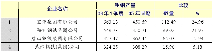 2006年一季度全國十大鋼鐵企業(yè)粗鋼生產(chǎn)情況