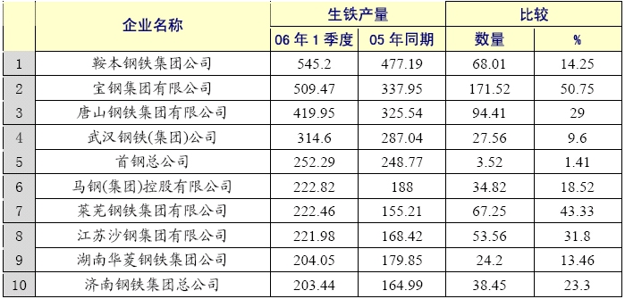 2006年一季度全國十大鋼鐵企業(yè)生鐵生產(chǎn)情況