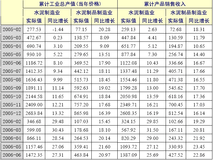 2006年1-6月,水泥制造業(yè)累計工業(yè)總產(chǎn)值1472.35億元,同比增長27.31%,增幅比上年同期上升了19.21個百分點(diǎn);實現(xiàn)產(chǎn)品銷售收入1387.09億元,同比增長25.69%,增幅比上年同期上升了15.26個百分點(diǎn)。 水泥制品制造業(yè)的產(chǎn)銷情況不如水泥制造業(yè),1-6月其工業(yè)總產(chǎn)值增速比水泥制造業(yè)低6.34個百分點(diǎn),產(chǎn)品銷售收入增速比水泥制造業(yè)低2.83個百分點(diǎn)。雖然水泥制品制造業(yè)的產(chǎn)銷增長情況不如整個水泥制造業(yè),但是其產(chǎn)銷增幅還是好于去年同期。