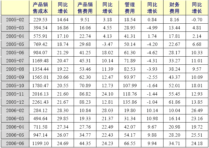 2006年1-6月,水泥制造業(yè)累計產(chǎn)品銷售成本為1199.10億元,同比增長24.69%,增幅比上年同期只上升了近3.4個百分點(diǎn);累計產(chǎn)品銷售費(fèi)用為44.35億元,同比增長24.23%,增幅比上年同期上升了6.21個百分點(diǎn);累計管理費(fèi)用為66.55億元,同比增長9.94%;累計財務(wù)費(fèi)用為34.71億元,同比增長24.18%。 2006年,水泥制造業(yè)成本上漲壓力較大,行業(yè)成本增長相對較快。由于銷售收入增速加快,銷售成本增速及費(fèi)用也相應(yīng)上升,但增幅均小于銷售收入的增幅。
