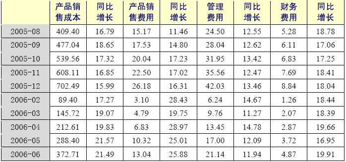 2006年1-6月,水泥制品制造業(yè)累計(jì)產(chǎn)品銷售成本為372.71億元,同比增長(zhǎng)21.49%,增幅比上年同期上升了2.73個(gè)百分點(diǎn);累計(jì)產(chǎn)品銷售費(fèi)用為13.04億元,同比增長(zhǎng)25.88%;累計(jì)管理費(fèi)用為21.14億元,同比增長(zhǎng)11.94%;累計(jì)財(cái)務(wù)費(fèi)用為4.87億元,同比增長(zhǎng)19.91%。除了財(cái)務(wù)費(fèi)用增幅低于水泥制造業(yè),其他費(fèi)用增幅均高于水泥制造業(yè),累計(jì)產(chǎn)品銷售成本增幅也低于水泥制造業(yè)。