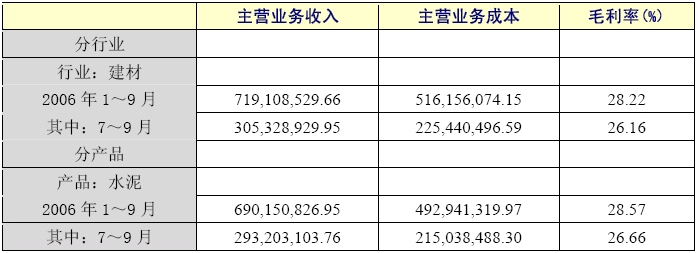 截至2006年9月30日,福建水泥股份有限公司共生產(chǎn)水泥252萬噸,銷售水泥248萬噸。2006年夏秋福建省在臺風、強降雨等自然災害過后,水泥需求穩(wěn)步增長,市場價格基本平穩(wěn),期末開始上揚,公司水泥產(chǎn)、銷兩旺,單季開始盈利。7-9月產(chǎn)、銷為95.86萬噸和104.06萬噸,同比分別增長15.67%和22.88%。7-9月實現(xiàn)主營業(yè)務收入305,328,929.95元、凈利潤1,991,362.58元,同比分別增長33.09%和77.09%。2006年1~9月,公司累計實現(xiàn)主營業(yè)務收入719,108,529.66元,同比增長30.53%,凈利潤-29,133,304.20元,同比降低27.97%。