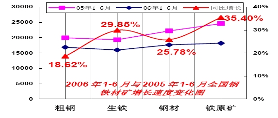 2006年1-6月鋼鐵材礦同比增長(zhǎng)情況