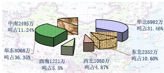 在全國(guó)19947萬(wàn)噸粗鋼產(chǎn)量中:華北地區(qū)生產(chǎn)7073萬(wàn)噸(占全國(guó)總量35.46%)、東北2250萬(wàn)噸(占全國(guó)總量11.28%)、西北1037萬(wàn)噸(占5.2%)、西南1228萬(wàn)噸(占6.16%)、華東6270萬(wàn)噸(占31.43%)、中南2089萬(wàn)噸(占10.47%)。在22195萬(wàn)噸鋼材中:華北地區(qū)生產(chǎn)6982萬(wàn)噸(占全國(guó)總量31.46%)、東北2352萬(wàn)噸(占全國(guó)總量10.60%)、西北1080萬(wàn)噸(占4.87%)、西南1221萬(wàn)噸(占5.5%)、中南2495萬(wàn)噸(占11.24%)、華東8068萬(wàn)噸(占36.35%)。