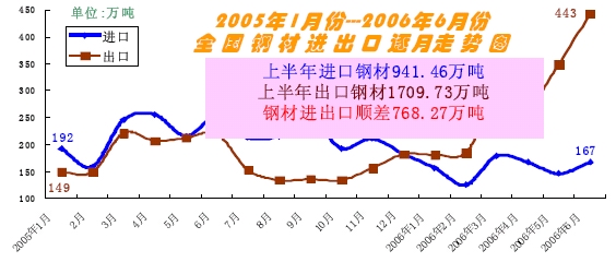 2006年1-6月鋼材進(jìn)出口逐月走勢