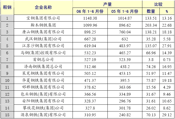 2006年6月累計(jì)粗鋼產(chǎn)量前十五家企業(yè)產(chǎn)量情況