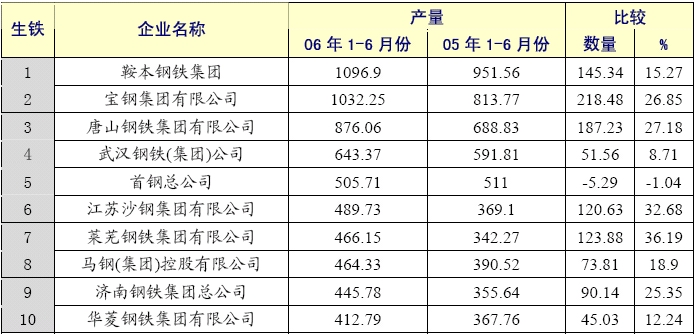 2006年6月累計(jì)生鐵產(chǎn)量前十五家企業(yè)