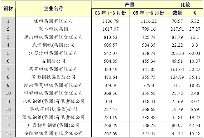 2006年6月累計(jì)鋼材產(chǎn)量前十五家企業(yè)