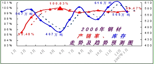 2006年鋼材產(chǎn)銷率、庫存走勢及趨勢預(yù)測