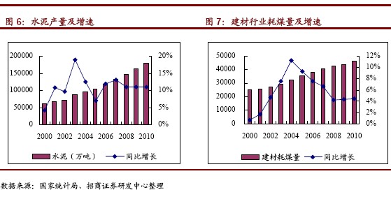 預(yù)計(jì)07 年、08 年水泥產(chǎn)量分別為131313 萬噸和145758 萬噸,同比分別增長13%和11%?紤]到每年4%的節(jié)能降耗,以及其他建材耗煤15000 萬噸,預(yù)計(jì)07 年、08 年的建材耗煤量為40495 萬噸和42211 萬噸,同比增長7.54%和6.67%。