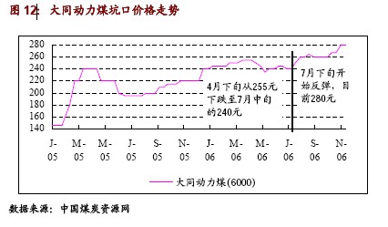 從7 月底開始,大同動力煤坑口價(不含稅)受需求拉動上漲至8 月底的265 元/噸,9 月份回調到260 元,10 月份上漲7 元/噸,11 月煤炭價格上漲13 元/噸至目前為280 元/噸,不斷創(chuàng)出年內新高。