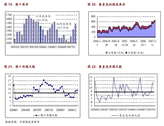 07年3 月份的港口庫存1473.9 萬噸,較06 年底的1037.4 萬噸上升了436.5 萬噸(或42.08%)。截止到4 月22 日,秦皇島的煤炭庫存為672.1 萬噸,較06 年底的440.6 萬噸增長了52.54%。與06 年6 月份的高位庫存相當(dāng)(當(dāng)時(shí)的高庫存直接導(dǎo)致了煤炭價(jià)格的走低)。