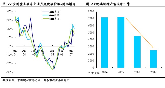 類似于水泥,2007年4 月份玻璃價格環(huán)比回升,其中3mm、4mm、5mm 價格分別同比回升6.1%、3.1%、2.4%。從季節(jié)性需求差異的角度理解,玻璃和水泥一樣每年第一季度因建筑施工減少、春節(jié)長假和設(shè)備檢修等因素,玻璃需求相對較小,進入4月份后,隨著天氣轉(zhuǎn)暖建筑施工引致玻璃需求增加,玻璃價格開始季度性的復蘇。 4 月份玻璃產(chǎn)銷率仍維持在104%的高水平,庫存率77%尚處適當水平。