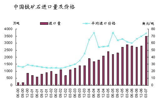 [冶金]2000-2007中國鐵礦石季度進(jìn)口量及價(jià)格