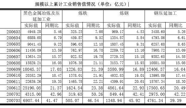 07年一季度,我國主要用鋼行業(yè)生產(chǎn)增長幅度都在20%以上,鋼材消費需求保持較高水平。且由于消費繼續(xù)旺盛,港忒行業(yè)總體銷售狀況繼續(xù)好轉(zhuǎn)。07年一季度累計,鋼鐵行業(yè)共完成工業(yè)銷售值6907.44億元,同比增長41.47%,增速比上年同期提高34.7各百分點。