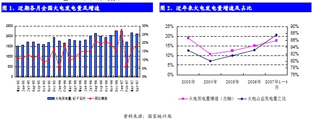 2007年1-4月,全國火電發(fā)電量為8330.9億千瓦時,同比增長17.6%,占全部發(fā)電量的比重高達87.3%,與06年相比,占比提高了4.2個百分點。從歷史數(shù)據(jù)可以看出,自2004年以來,火電發(fā)電量增速及其占全國總發(fā)電量之比呈上升趨勢。