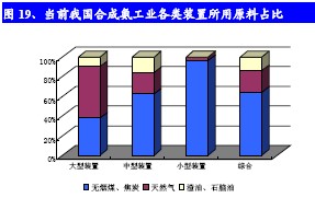 目前,合成氨行業(yè)中以無(wú)煙煤或焦炭為原料的企業(yè)約為65%,以天然氣為原料的約占22%,其余部分主要以重油或石腦油為原料。