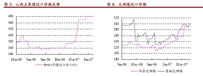 7 月20 日,柳林四號(hào)煤坑口不含稅價(jià)格為460 元/噸,近兩個(gè)月維持穩(wěn)定,但較3 月底上漲了50元/噸,較去年年底上漲了100 元/噸。