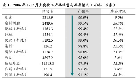 截至到去年12 月底,國(guó)內(nèi)大部分化工產(chǎn)品都保持著產(chǎn)銷兩旺的良好勢(shì)頭,產(chǎn)銷率多在90%以上。但是鉀肥、塑料樹(shù)脂、燒堿、純堿、輪胎、磷肥等產(chǎn)品的庫(kù)存增加較大,表明下游需求增速與產(chǎn)量增速仍有一定差距,除鉀肥嚴(yán)重產(chǎn)不足需以外,其他幾類產(chǎn)品都面臨著不同程度的供大于求。