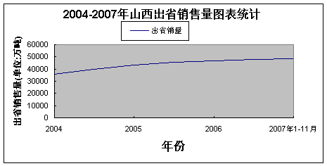 2004-2007年11月份,山西煤炭出省銷售量呈逐年上升趨勢,從2004年的35865.52萬噸增長至2006年的46641萬噸,增長10775.48萬噸,平均增長率為15.02%。2007年1-11月份出省銷量48615萬噸,同比增長17.43%。