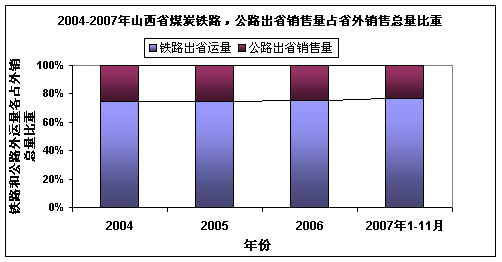 2004-2007年11月份山西煤炭鐵路出省運(yùn)量占出省運(yùn)量總量的比例基本維持在75%左右,占出省運(yùn)量總量的四分之三。2004-2007年11月份山西煤炭鐵路出省銷售量占山西煤炭出省銷售總量比重呈逐年小幅上揚(yáng)態(tài)勢,但增幅較小,平均增長率僅為 0.85%。