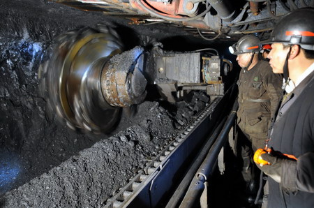 2月3日,同煤集團(tuán)的礦工在采煤機(jī)旁工作。