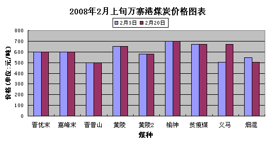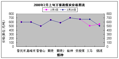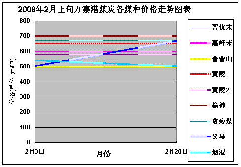 2008年2月上旬萬寨港煤炭各煤種價格總體并無明顯變化,除義馬和煙混兩煤種價格有所變化外,其余走勢基本保持平穩(wěn)態(tài)勢。