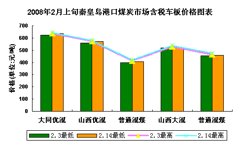 大同優(yōu)混煤車板含稅價格相對高位,價格位居秦皇島港口各煤炭品種價格首位。2008年2月上旬大同優(yōu)混煤車板含稅價格整體呈現(xiàn)上揚趨勢,含稅車板最低價格由2月3日的625元/噸攀升至2月14日635元/噸,攀幅10元/噸。含稅車板最高價格由2月3日的640元/噸攀升至2月14日645元/噸,攀幅5元/噸。