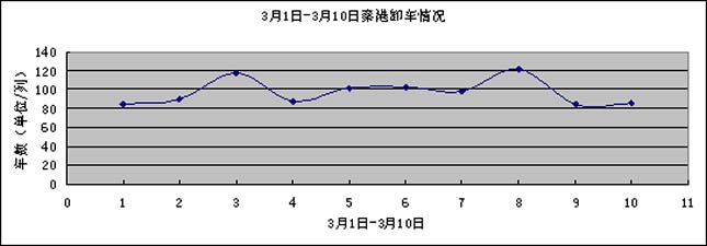 3月1日- 3月10日這段時(shí)間內(nèi),接卸最多的一天為122列,最少的一天為84列。其中 3月 8日接卸車數(shù)最多為122列; 3月1日、9日接卸車數(shù)最少為84列; 3 月2日、4日接卸車數(shù)在90列左右;3月3日接卸車數(shù)為118列,3月5、6日接卸車數(shù)在102列左右。3月7日接卸車數(shù)為98列。3月10日接卸車數(shù)為85列.本月上旬接卸車數(shù)比上月末接卸車數(shù)量有所增加,煤炭卸車數(shù)量的增加對(duì)秦皇島場(chǎng)存的上升起到了推動(dòng)作用。