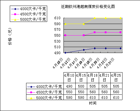 近期欽州港煤炭價格的上漲,主要是受越南政府煤炭政策的調(diào)整引起的,四月中旬之前受越南政府限制高卡無煙煤的出口,導(dǎo)致了當時欽州港的煤炭主要以進口4000大卡/ 千克。所以中旬的4000大卡/ 千克無煙煤有10-15元的上漲,而從15日之后漲價蔓延到了4500大卡/ 千克無煙煤和5000大卡/ 千克無煙煤,兩者的分別上漲10元和20元。之后保持穩(wěn)定,但是隨著從4月22日開始越南煤炭出口關(guān)稅從10%提高到15%,在需求較為穩(wěn)定的情況下,欽州港后市的進口無煙煤的價格會呈現(xiàn)上漲的態(tài)勢。