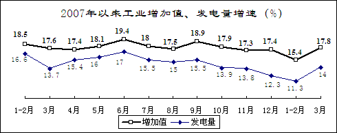 發(fā)電量增速減緩,效益明顯下降。全國(guó)發(fā)電量8051億千瓦時(shí),增長(zhǎng)14%,減緩1.5個(gè)百分點(diǎn);其中,火電、水電分別增長(zhǎng)13.4%和11.4%。由于受災(zāi)電網(wǎng)全面恢復(fù)正常和災(zāi)后恢復(fù)重建等多方面因素,電力需求呈快速增長(zhǎng)之勢(shì)。3月份,廣東、廣西、云南、貴州4個(gè)省級(jí)電網(wǎng)出現(xiàn)拉限電,其中廣東電力供應(yīng)持續(xù)偏緊。前兩個(gè)月,由于煤炭?jī)r(jià)格上漲和低溫雨雪冰凍災(zāi)害造成嚴(yán)重?fù)p失,電力行業(yè)實(shí)現(xiàn)利潤(rùn)95.4億元,下降55.9%,去年同期為增長(zhǎng)59.2%。其中,電力生產(chǎn)業(yè)、電力供應(yīng)業(yè)利潤(rùn)分別下降70.6%和37.6%,去年同期為增長(zhǎng)40.1%和89.8%。