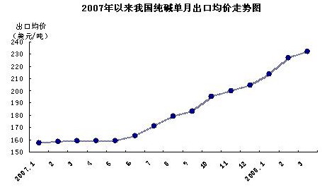 三、美國純堿價格上調(diào)支撐了我國的出口價格。由于國際市場需求持續(xù)增長,美國將2008年每噸純堿出口合同價格在2007年基礎上提高20%,價格調(diào)高15~30美元,此舉支撐了我國純堿出口價格的提升。