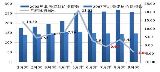 2、 前三個季度美國經(jīng)濟減速明顯,二季度經(jīng)濟增長修正后的數(shù)值為2.8%,比早先估計的數(shù)值大約縮水了0.5個百分點。三季度增長預計低于1%。然而受惠于粗鋼產(chǎn)量增長較慢的形勢,北美鋼材市場價格回落走勢遠遠小于亞洲市場。美國粗鋼產(chǎn)量在6月和9月為同比負增長,除1月份外其他月份增長也明顯低于全球同期增長速度。1-9月美國粗鋼產(chǎn)量同比增長4%,增速低于全球產(chǎn)量增速0.6個百分點。同時,鋼材庫存和進口數(shù)量始終處于較低水平,資源供求基本平衡成為鋼價高位運行的主要原因。9月末,CRU北美鋼材綜合價格指數(shù)降至263.8點,環(huán)比上月降幅達3.86%,同比上升54.99%。1-9月平均價格指數(shù)為258.7點,同比上升75.27%。