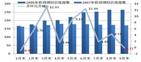 歐洲地區(qū)受美國金融危機的影響經(jīng)濟增長明顯減速,根據(jù)歐盟統(tǒng)計局的數(shù)字,二季度歐元經(jīng)濟區(qū)經(jīng)濟較一季度下降0.2%,是至1995年有統(tǒng)計記錄以來歐元區(qū)經(jīng)濟季度環(huán)比首次出現(xiàn)負增長,預計三季度將會再次出現(xiàn)負增長。英國三季度環(huán)比季降0.5%,是近年來首次經(jīng)濟負增長,德國、法國和意大利等國家經(jīng)濟增長也陷于停滯和負增長的困境。歐盟(27國)1-5月粗鋼產(chǎn)量同比降低了0.7%,6-7月和第三季度產(chǎn)量略有增加,同比增長了2.1%;1-9月粗鋼產(chǎn)量同比僅增長了1.2%。在進口下降和出口增長的情況下,資源供需基本平衡。廢鋼等原料價格大幅回落,今年前7個月,國際市場廢鋼、生鐵價格一路攀升,7月初CRU廢鋼價格指數(shù)曾達到496點,同比上升了1.12倍;8-9月廢鋼價格迅速回落,9月末至322.3點,但仍比上年同期上升了38.0%。廢鋼成本上升對鋼材價格形成有利支撐,但很顯然支撐的力度在減弱。至9月末,CRU歐洲鋼材綜合價格指數(shù)降至263.8點,環(huán)比上月降幅0.11%,同比上升54.99%。1-9月平均價格指數(shù)為221.8點,同比上升48.84%。