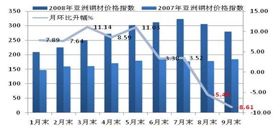 亞洲地區(qū)經(jīng)濟增長迅猛,在需求強勁增長和原燃材料價格大幅上升的推動下,1-7月亞洲市場鋼材價格迅速上升,至7月末CRU亞洲鋼材價格指數(shù)達到323.1點,同比上升82.23%,比北美地區(qū)和歐洲地區(qū)升幅分別高5.9和37.4個百分點。受美國次貸危機引發(fā)的金融風暴影響,以及中國舉辦奧運會以及自然災害等多重因素的共同作用下,8-9月中國市場鋼材價格急劇滑落,并帶動亞洲市場鋼材綜合價格指數(shù)呈現(xiàn)為明顯的下跌態(tài)勢,至9月末,價格指數(shù)降至279.1點,同比上升51.77%。1-9月平均價格指數(shù)為258.7點,同比上升75.27%。
