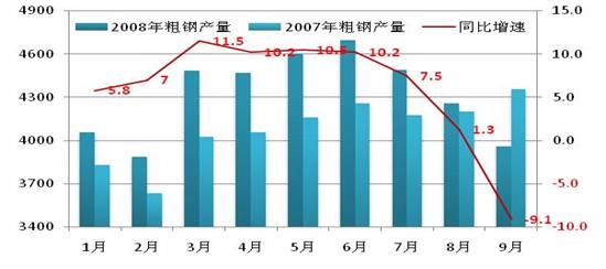 1、全球經(jīng)濟增長趨緩,國際、國內(nèi)兩個市場需求有所下降。國內(nèi)經(jīng)濟增長呈回落態(tài)勢,一季度GDP增長10.6%,二季度GDP增長10.1%,三季度GDP增長9.9%,經(jīng)濟增長速度逐季回落,已由偏熱轉向穩(wěn)定區(qū)間。雖然需求將有所回落,但預計資源供給數(shù)量減少得更快,1-9月累計產(chǎn)鋼3.91億噸,平均日產(chǎn)水平142.7萬噸,但9月份粗鋼3961.42萬噸,同比指數(shù)首次降為負數(shù),日產(chǎn)水平僅為132.05萬噸,以此測算后四季度粗鋼產(chǎn)量約為1.21億噸,預計全年產(chǎn)鋼5.12億噸,比上年增加2320萬噸,增長4.74%,比上年粗鋼產(chǎn)量增速降低了11個百分點?傮w國內(nèi)鋼鐵市場不會出現(xiàn)嚴重供大于求。