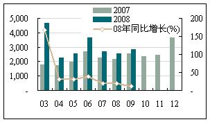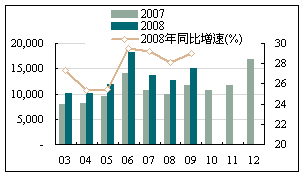從投資狀況來看,除了內(nèi)蒙古、上海、山東外,其他各地區(qū)的固定資產(chǎn)投資環(huán)比增長率基本恢復(fù)正增長:奧運(yùn)會禁止施工的后續(xù)影響在逐步消除,北京及周邊各地區(qū)正處于逐步恢復(fù)的狀態(tài);山東省始終沒有改變其環(huán)比增速的負(fù)增長狀態(tài):-17.48%(7月)、-25.23%(8月)、-18.17%(9月),累計完成額為9593.56億元,同比增長22.30%,占全國比重9.61%,居首位。