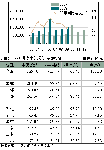 9月份,水泥投資完成額為1,045,710萬元,較8月份增長17.17%,與去年同期相比增長71.41%,下降近23個百分點(diǎn)。