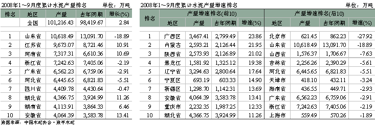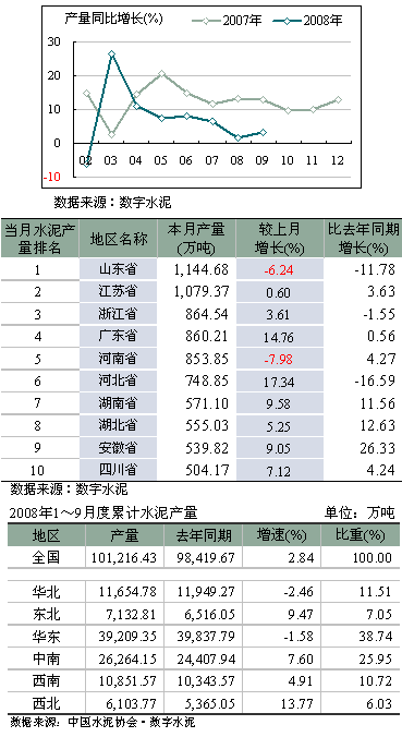 1~9月份水泥累計產(chǎn)量同比增長2.84%,為10.12億噸。就區(qū)域分布狀況來看,華東、中南水泥產(chǎn)量與投資相吻合,占較大比重,分別為38.74%和25.95%,但華東地區(qū)同比增速下降1.58%。