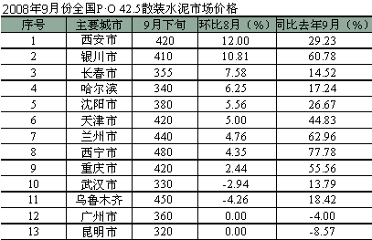 9月份的水泥價格絕大部分省市保持穩(wěn)定。全國31個省會城市中,有9個城市的水泥價格出現(xiàn)上漲,其中上漲幅度較大的是陜西,上漲了45元;寧夏上漲了40元,市場需求的拉動和原材料價格的上升成為價格上漲的主要推動因素。