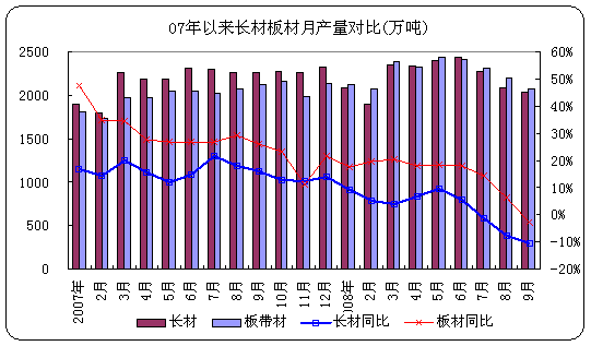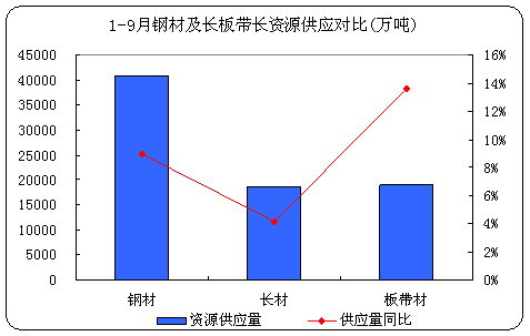 今年以來,國內(nèi)鋼材總體產(chǎn)量增速呈逐步放緩趨勢,其中長材產(chǎn)量始終保持低增增長,前三季度累計產(chǎn)量僅較去年同期增加2%,同期鋼材和板帶材則分別增加8.1%和14.3%,且7、8、9三個月長材產(chǎn)量持續(xù)出現(xiàn)負增長,9月產(chǎn)量同比下降了10個百分點。之所以如此,關(guān)鍵在于近兩年新增產(chǎn)能絕大部分是板帶材,同時長材產(chǎn)品中的螺線生產(chǎn)企業(yè)不少是民營企業(yè),產(chǎn)量很容易受到盈利、成本等因素的影響。基于此,1-9月長材供應(yīng)量同比增加約4個百分點,板帶材則增加13.6%。在大致相當?shù)男枨蟓h(huán)境下,資源供應(yīng)量增幅有限為長材市場贏得了較好的抗跌性。