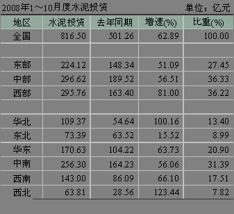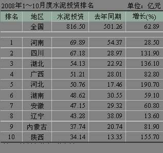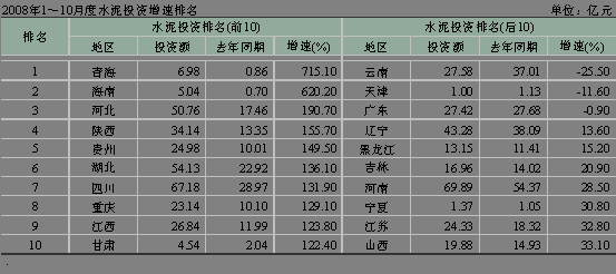 河北省受曹妃甸開發(fā)等因素拉動,水泥投資勢頭迅猛,1~10月份累積水泥投資額達到了50.76億元,同比增長190.70%,排名第三。