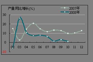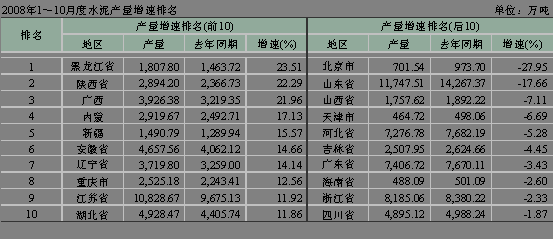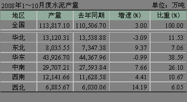 從1~10月份水泥累計產(chǎn)量看,為113,817.10萬噸,同比增長僅3.00%。華北、華東地區(qū)甚至出現(xiàn)負增長,華北為-3.09%,華東為-0.99%。