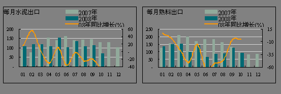 受金融危機的影響,全球經(jīng)濟增長放緩,對水泥需求減緩,影響水泥產(chǎn)品的出口。10月份的水泥出口量進一步減少,僅為68.15萬噸,環(huán)比下降39.71%,同比下降46.94%,較9月份下降近26個百分點;水泥熟料出口91.81萬噸,環(huán)比下降26.93%,同比下降5.17個百分點。