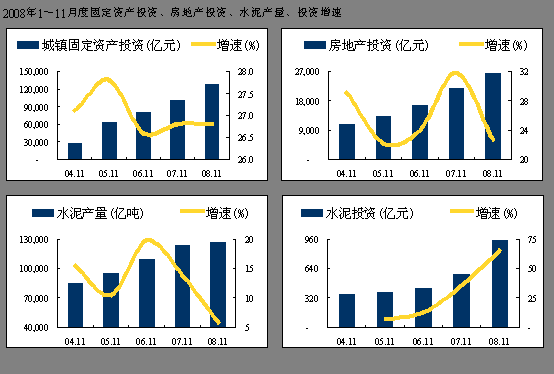 受國際金融風(fēng)暴在下半年影響深化,從前11個月的數(shù)據(jù)來看,我國固定資產(chǎn)投資增速繼續(xù)回落:2008年1~11月份,共完成固定資產(chǎn)投資127,614億元,同比增長26.80%,名義增長率與2007年基本持平 (若扣除原材料成本上漲因素,投資增速要低于2007年同期)。其中房地產(chǎn)投資回落幅度明顯,1~11月份投資26,546億元,同比增長22.72%,較2007年同期增速下降了9.1個百分點(diǎn)。