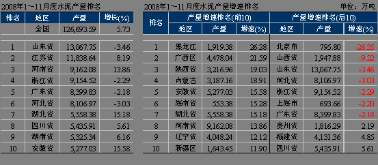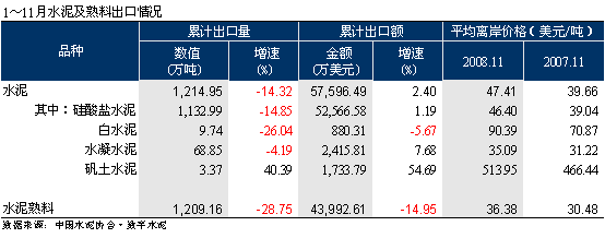 金融風(fēng)暴在全球愈演愈烈,世界經(jīng)濟(jì)衰退,出口表現(xiàn)最為明顯。我國水泥出口的主要國家,如美國、俄羅斯等國的經(jīng)濟(jì)均受到巨大動蕩,對水泥的出口需求減弱。截止2008年1~11月,水泥、熟料比2007年同期都有所下降,熟料出口大幅下跌,同比減少達(dá)28.75%,水泥出口同比減少14.32%。