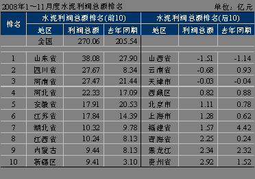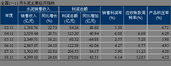 1~11月,全國水泥利潤總額創(chuàng)歷史新高,達(dá)到270.06億元,超出2007年同期64.52億元,同比增長31.39%,大大高于銷售收入漲幅,產(chǎn)業(yè)盈利繼續(xù)向好。
