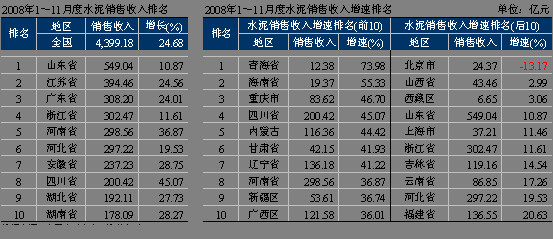 1~11月,水泥產(chǎn)業(yè)實(shí)現(xiàn)銷售收入4,399.18億元,同比增長24.68%,較2007年提高2個百分點(diǎn)。除北京由于奧運(yùn)影響,是各省市中唯一的銷售收入負(fù)增長區(qū),其他的省份的銷售收入均出現(xiàn)不同幅度的提高。