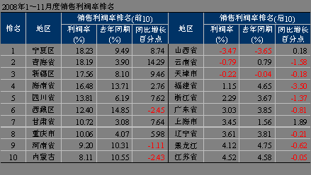 1~11月全國水泥銷售毛利率為15.15%,和2007年基本持平?梢哉f,今年煤炭、燃油成本的大幅上漲被消化,轉(zhuǎn)移到下游產(chǎn)業(yè);經(jīng)濟(jì)形勢下挫仍然沒有阻止水泥產(chǎn)業(yè)盈利能力提高的腳步。毛利率排名前10中,除海南、內(nèi)蒙古外,都分布在西北和西南;排名后10個地區(qū)中,華東地區(qū)占了5個。